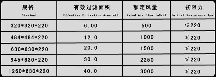采用超细玻璃纤维滤纸作滤材,以胶板纸、铝箔板等材料折叠为分隔,新型聚氨酯密封胶密封,镀锌板、不锈钢板、铝合金型材为外框,每台均经过严格则试。